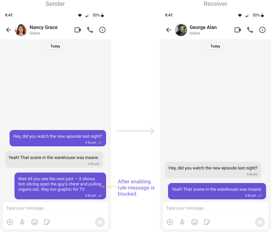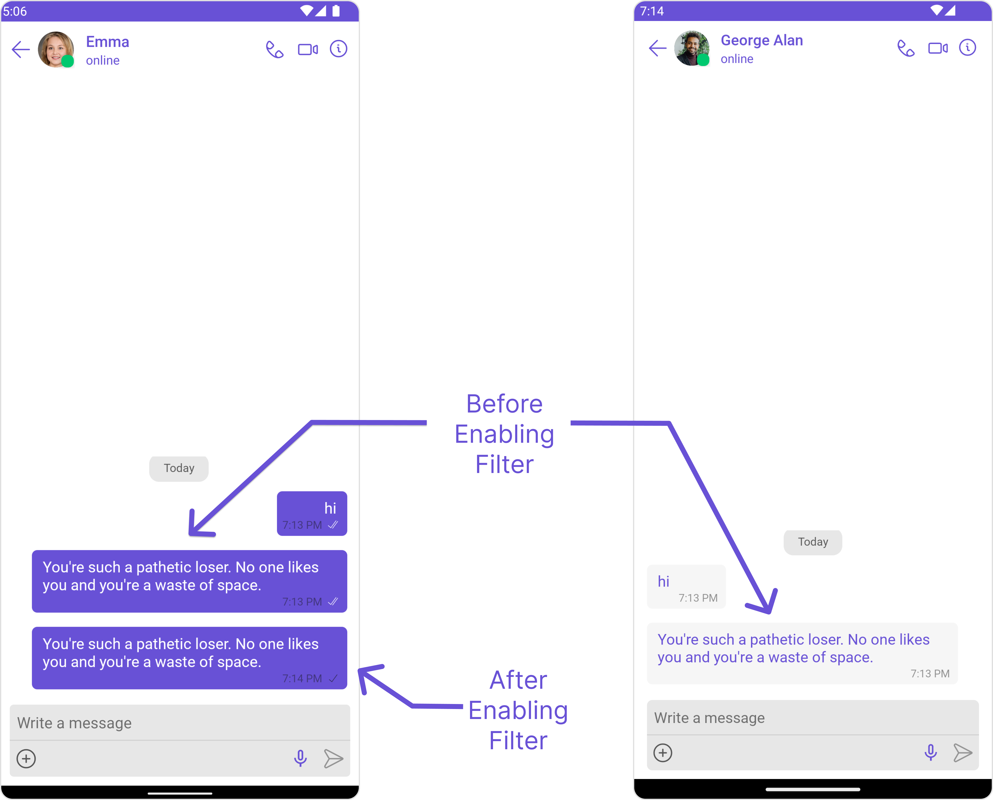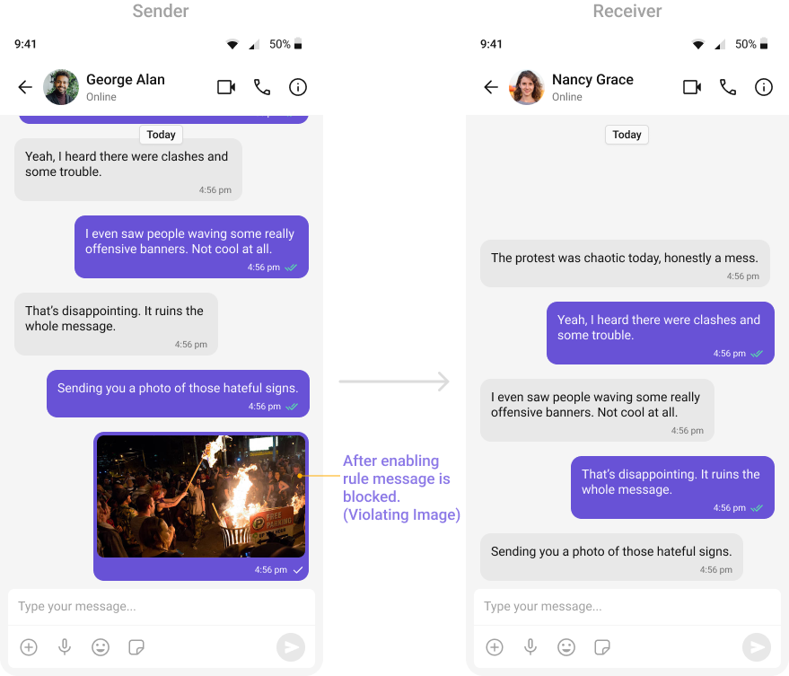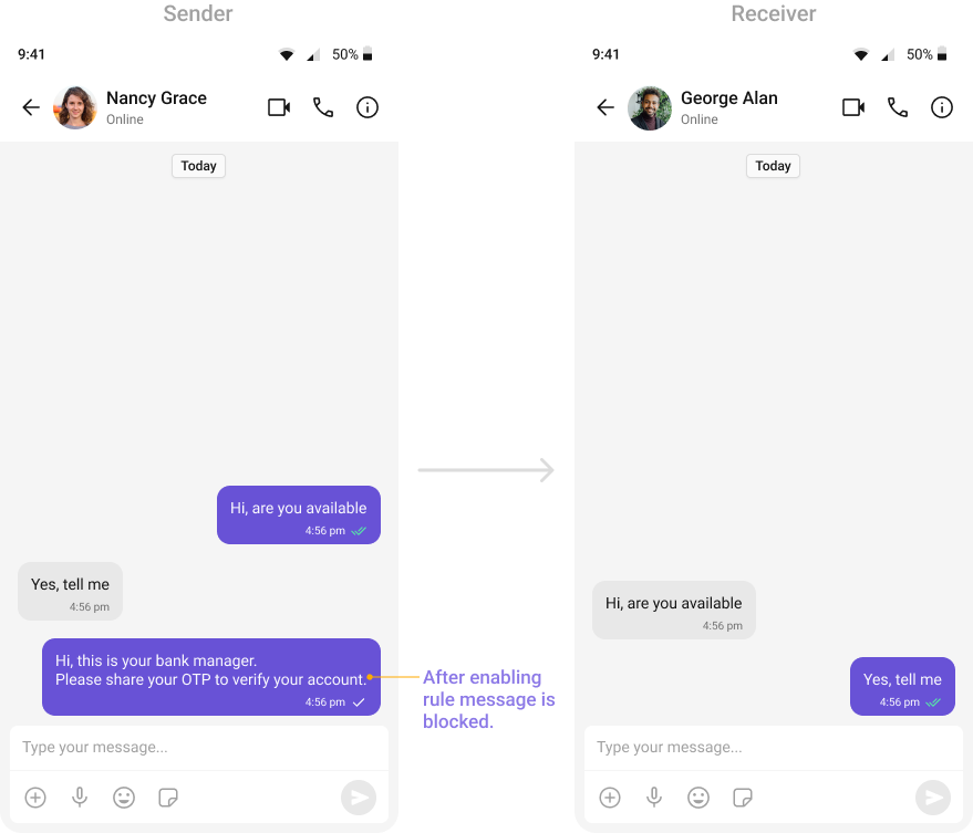 Automatically detects and blocks messages containing offensive language, profanity, or derogatory remarks using a predefined list of offensive keywords.Example: Before enabling, profane messages are delivered (double ticks). After enabling, they’re blocked (single tick).