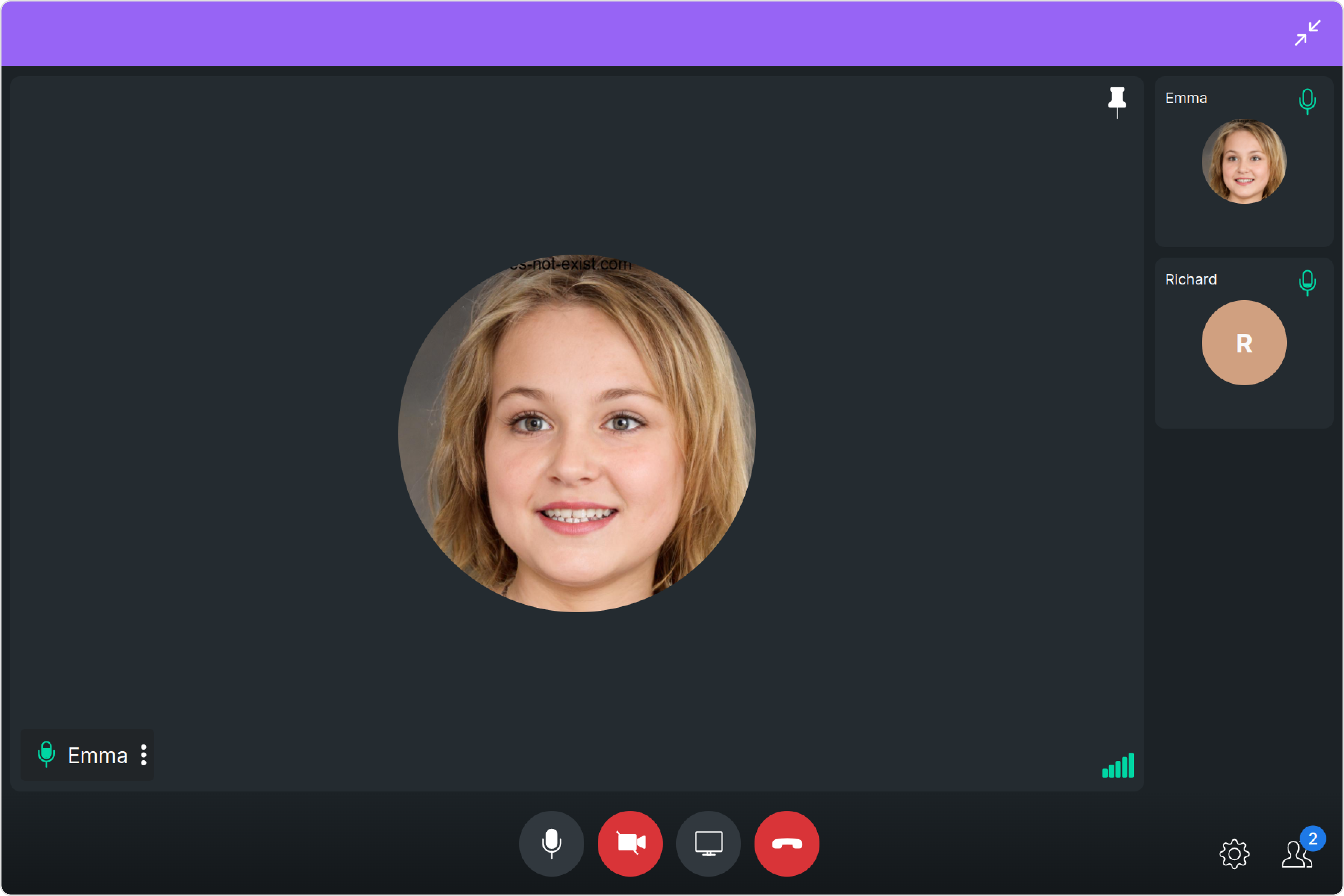 TheOngoing Call is a Component that provides users with a dedicated interface for managing real-time voice or video conversations. It includes features like a video display area for video calls, call controls for mic and camera management, participant information, call status indicators, and options for call recording and screen-sharing.
