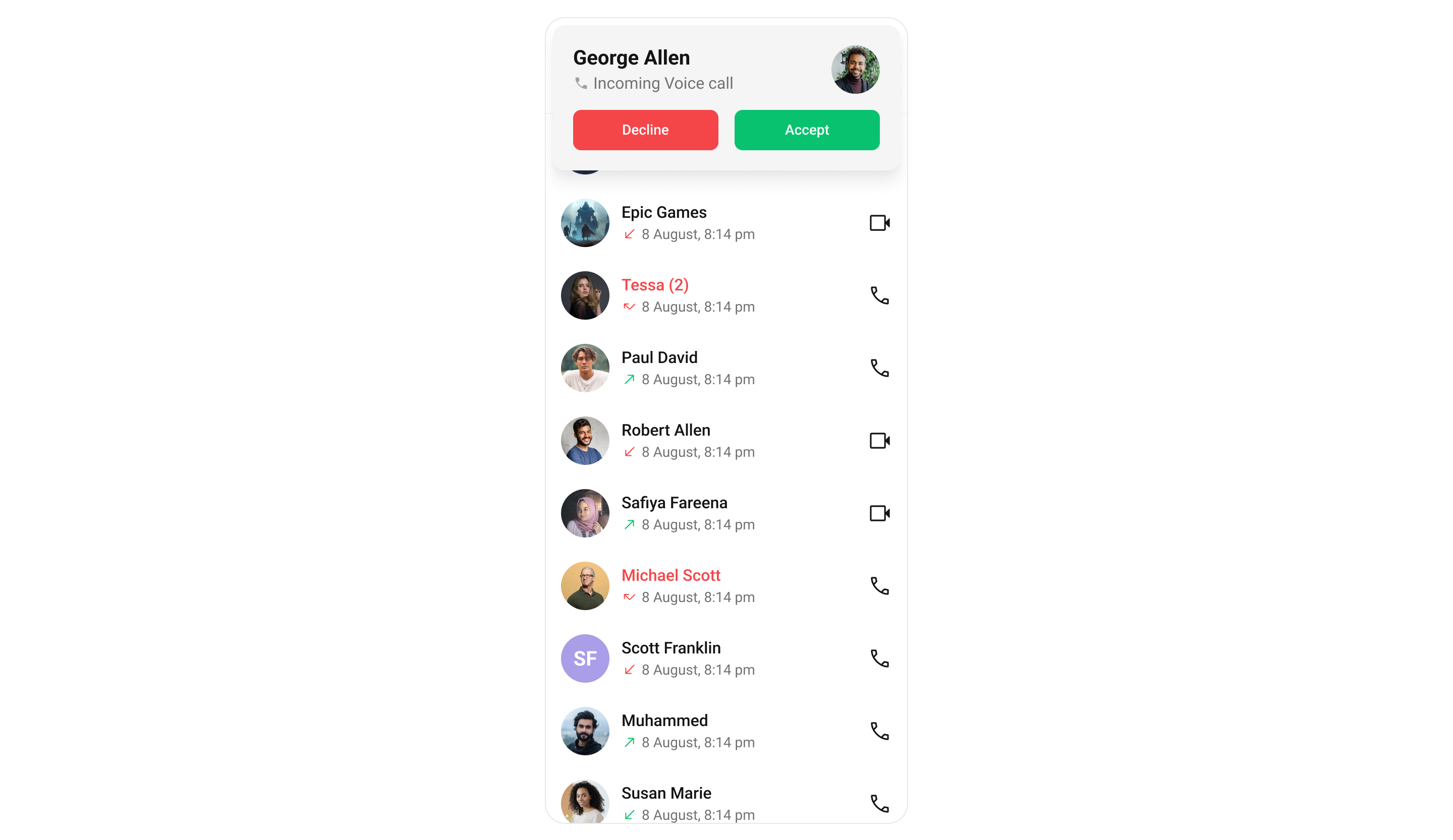 The Incoming Call widget of the CometChat UI Kit provides the functionality that lets users receive real-time audio and video calls in the app. When a call is made to a user, the Incoming Call widget triggers and displays a call screen. This call screen typically displays the caller information and provides the user with options to either accept or reject the incoming call.