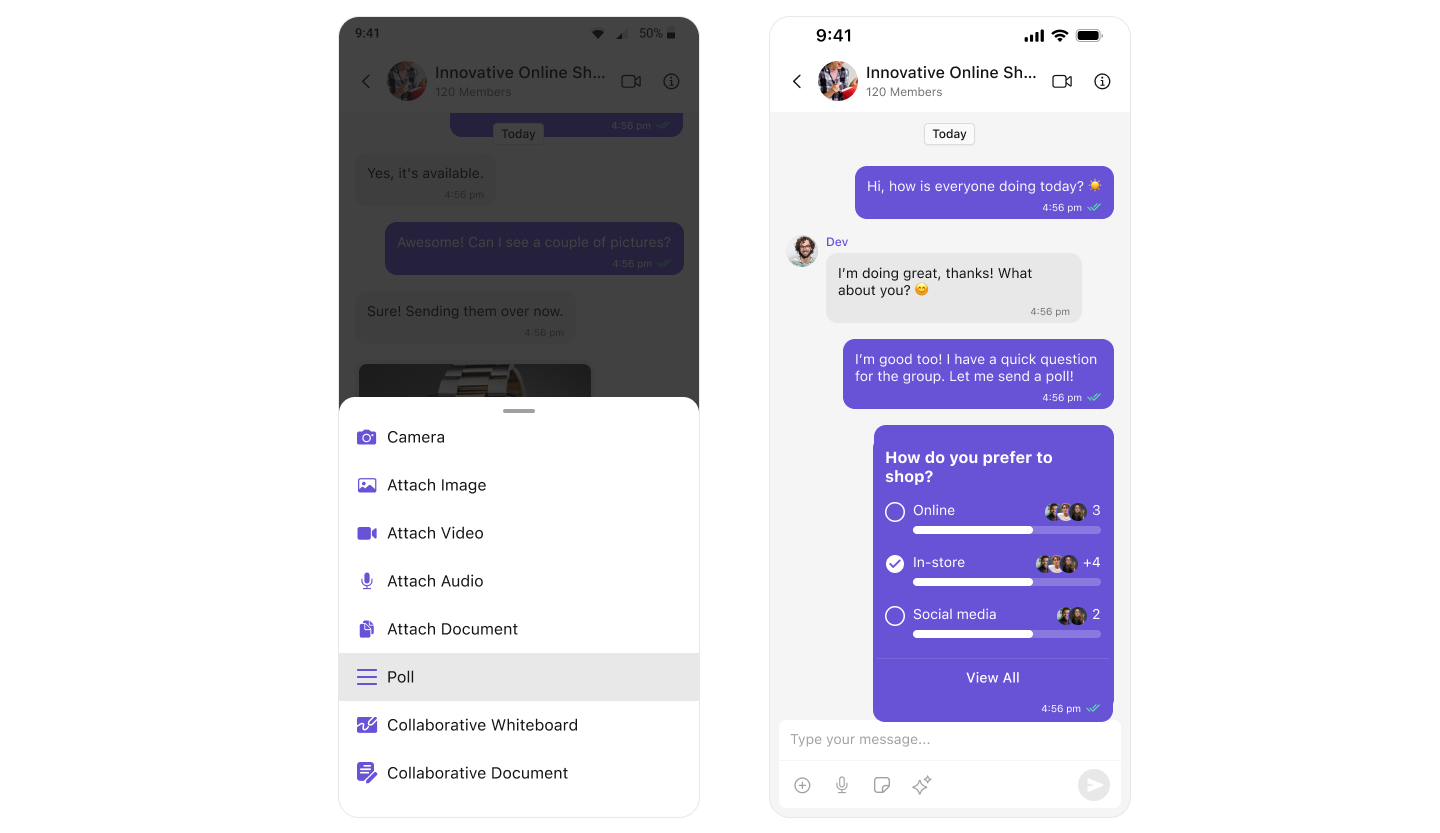 The Polls extension enhances group discussions by allowing users to create polls. Users can ask questions with a predefined list of answers, enabling a quick, organized way to gather group opinions. For a comprehensive understanding and guide on implementing and using the Polls Extension, refer to our specific guide on the Polls Extension. Once you have successfully activated the Polls Extension from your CometChat Dashboard, the feature will automatically be incorporated into the Action Sheet of the Message Composer component of UI Kits.