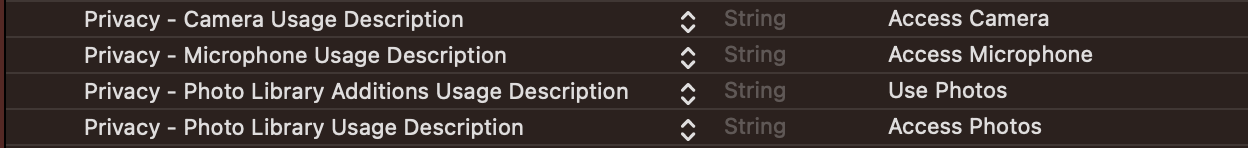- Allow Camera, Microphone and photo Library access in Info.plist