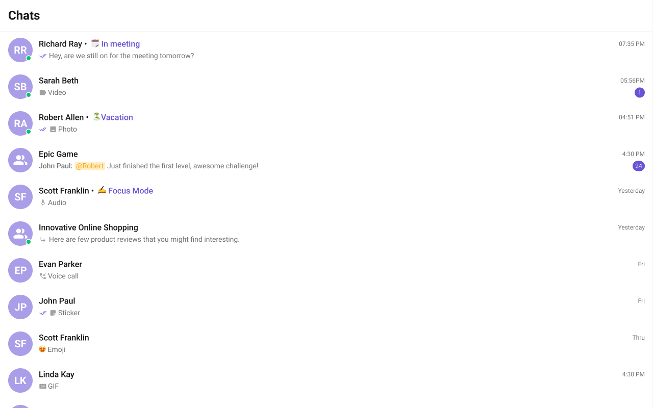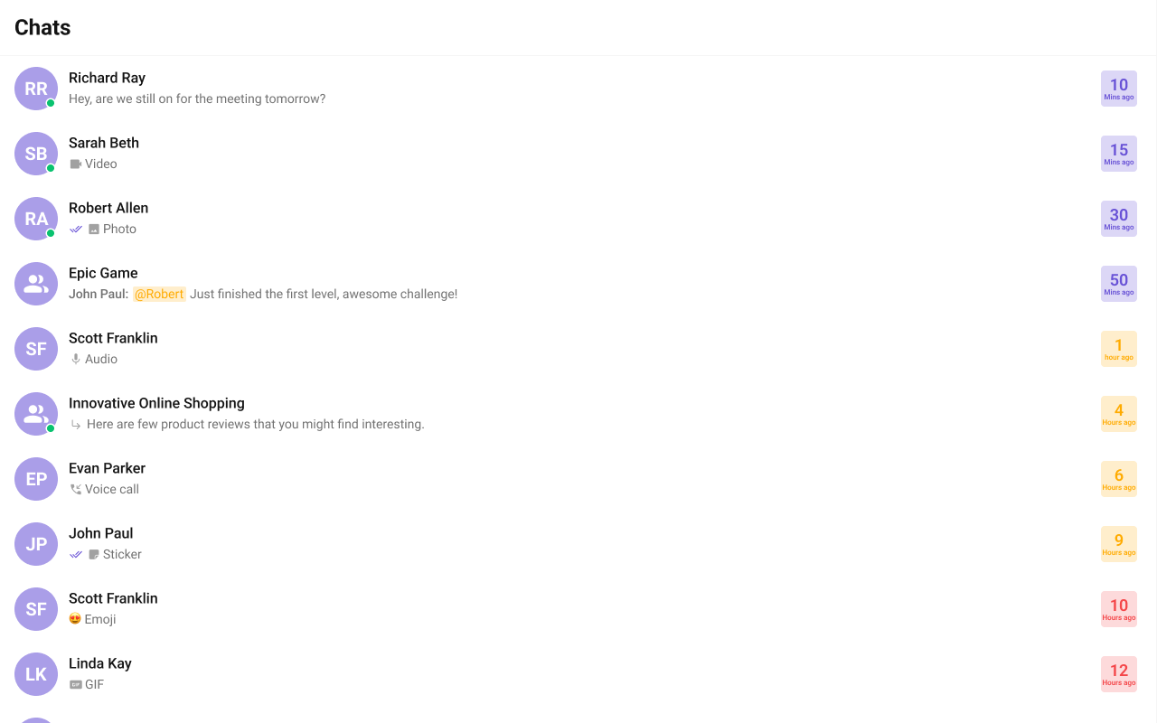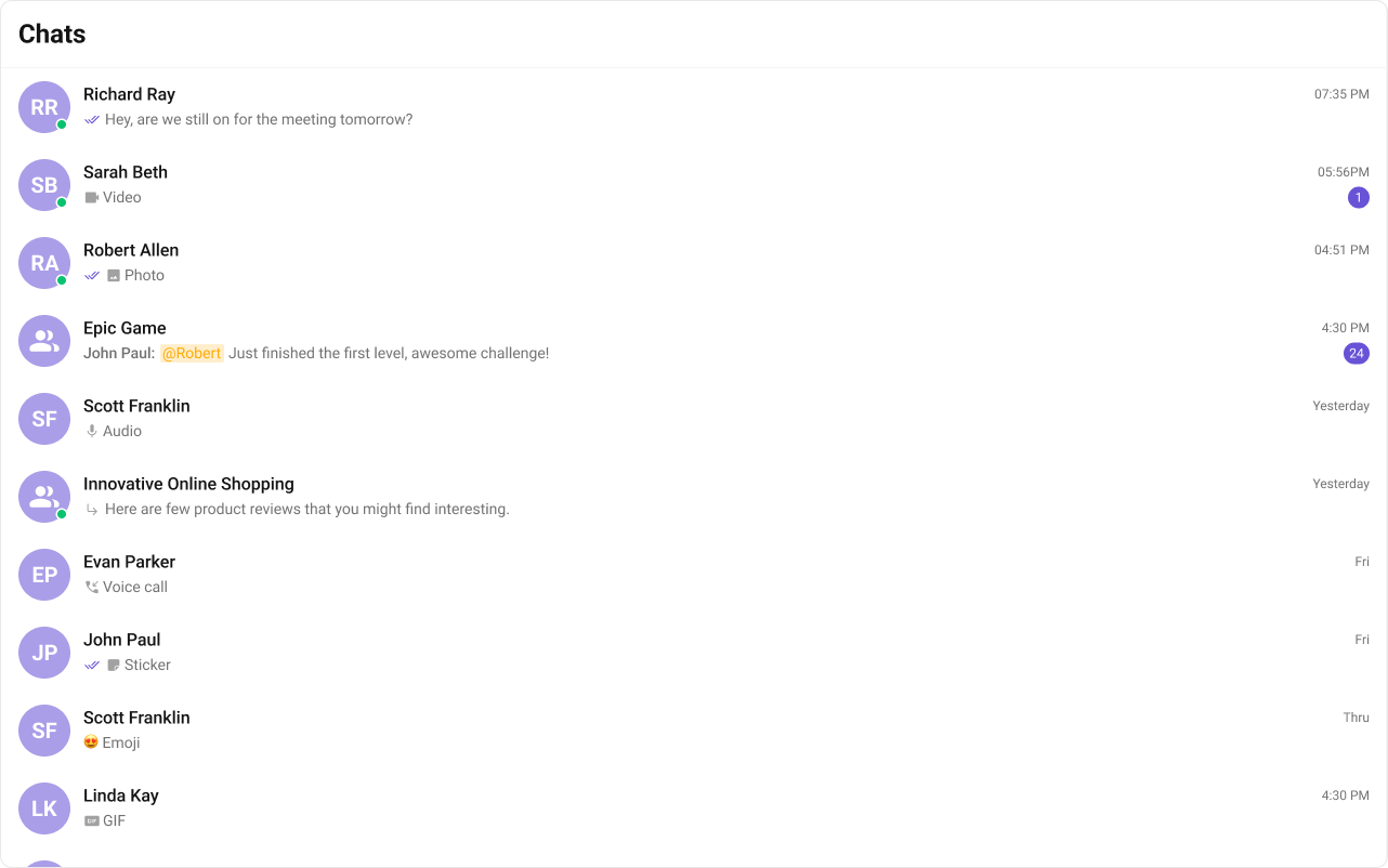 onUserOnline / onUserOffline | Updates online/offline status dot (unless hideUserStatus={true}) |