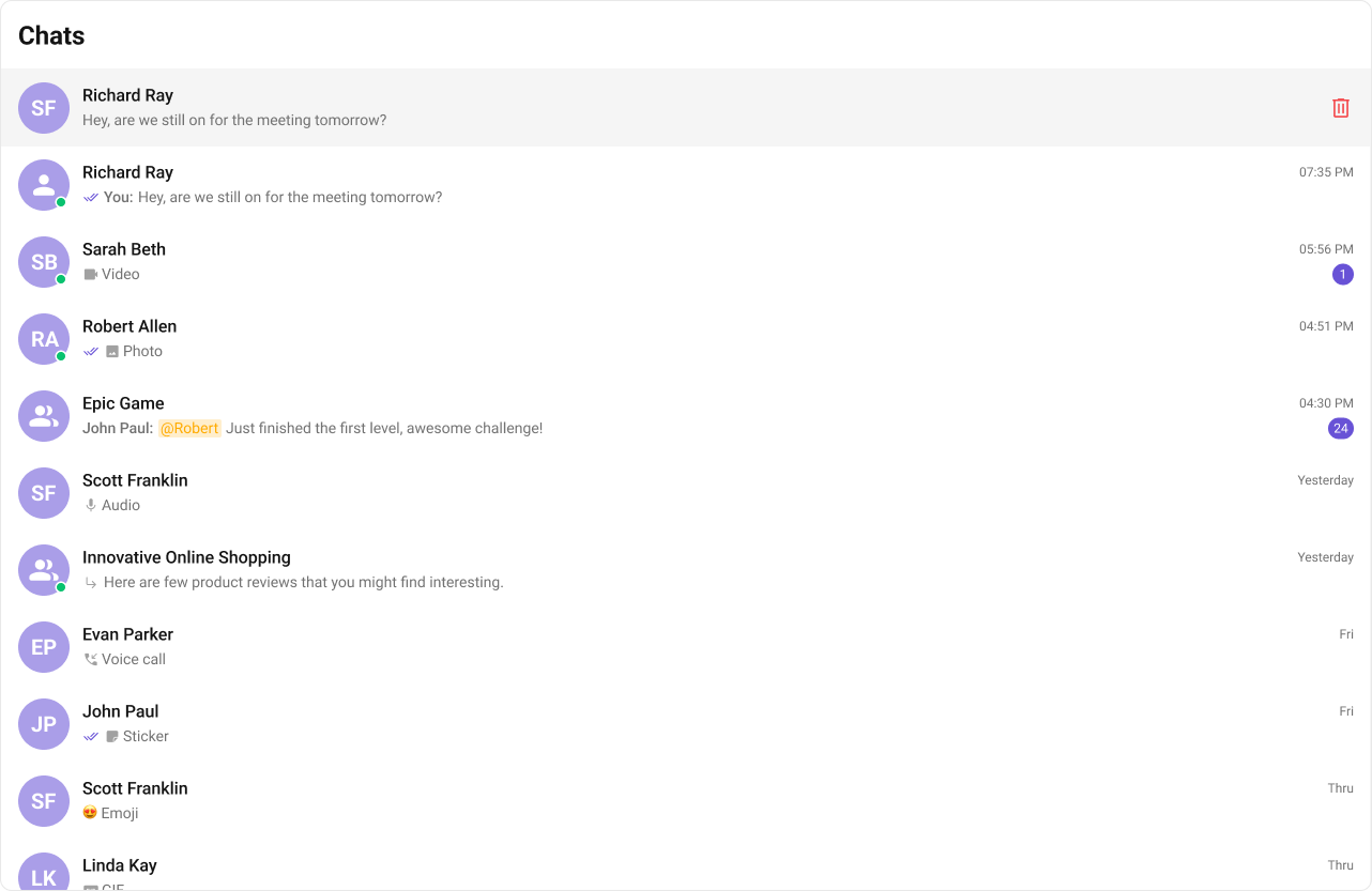 onTextMessageReceived / onMediaMessageReceived / onCustomMessageReceived | Moves conversation to top, updates last message preview and unread count |