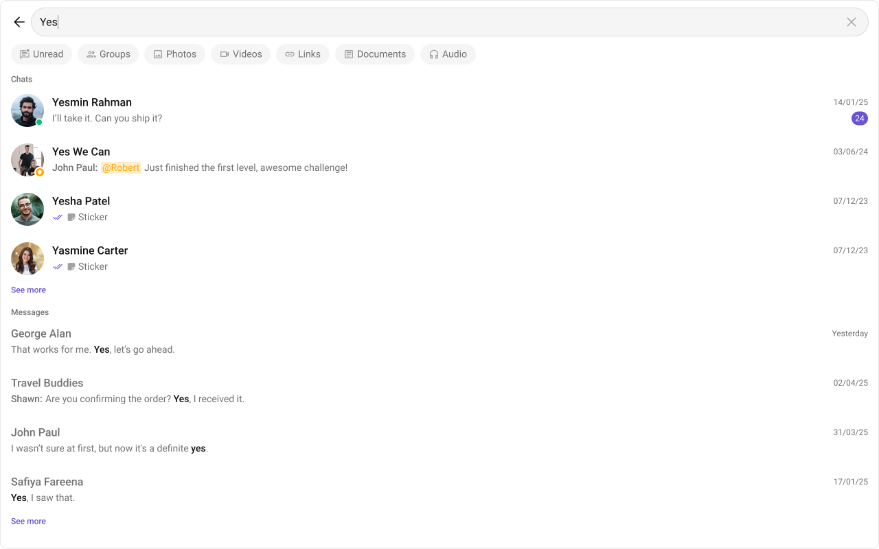 | Search | Search allows users to search across conversations and messages in real time. Users can click on a result to open the conversation or jump directly to a specific message. |