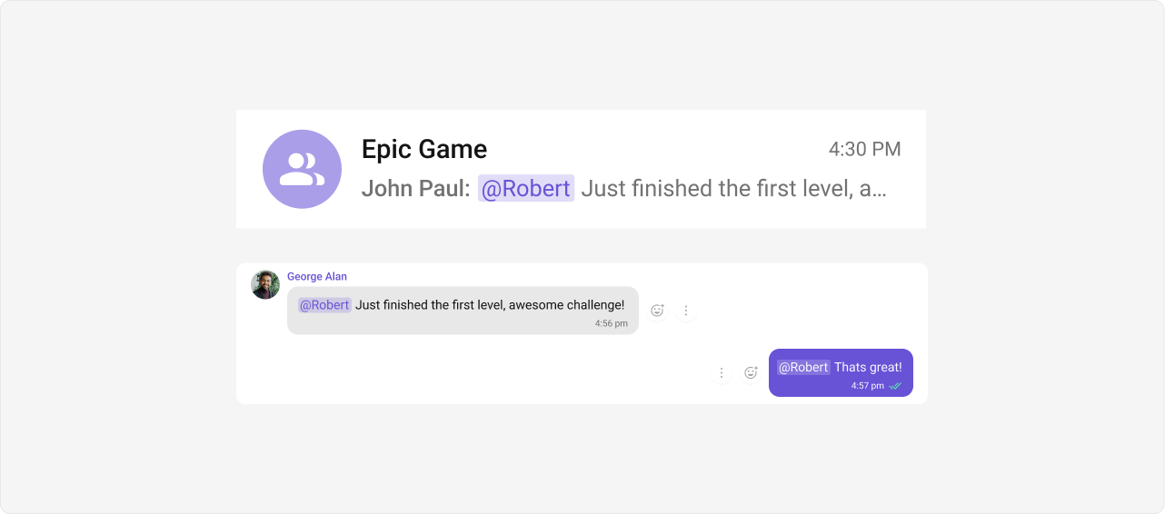 Mentions is a robust feature provided by CometChat that enhances the interactivity and clarity of group or 1-1 chats by allowing users to directly address or refer to specific individuals in a conversation. The feature also supports group mentions like @all, enabling users to quickly notify all members in a group chat simultaneously.