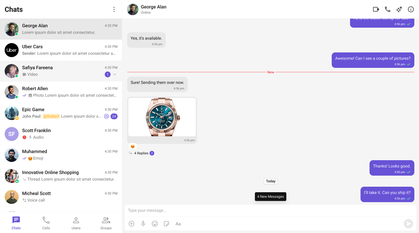| Conversations | Conversations is a component that renders conversation list item. Conversation item also displays the delivery status of the last message providing users with real-time updates on the status of their messages. |