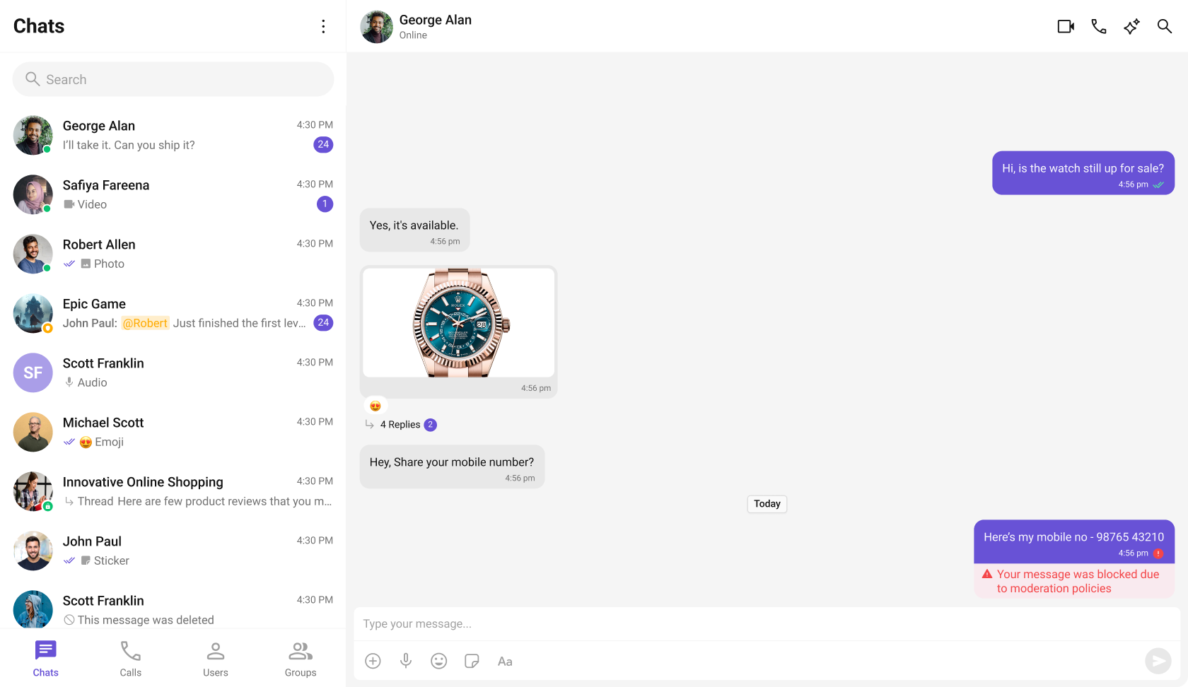 CometChat’s Message Moderation feature helps maintain a safe and respectful chat environment by automatically filtering and managing inappropriate content. Messages can be automatically blocked or flagged based on predefined rules, ensuring harmful content is handled before it reaches users.