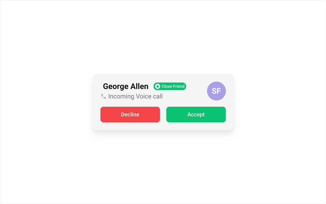 The accept and decline buttons are keyboard-focusable and activate on Enter/Space. The caller name and call type are exposed as text content. The component renders as an absolutely positioned overlay.Props