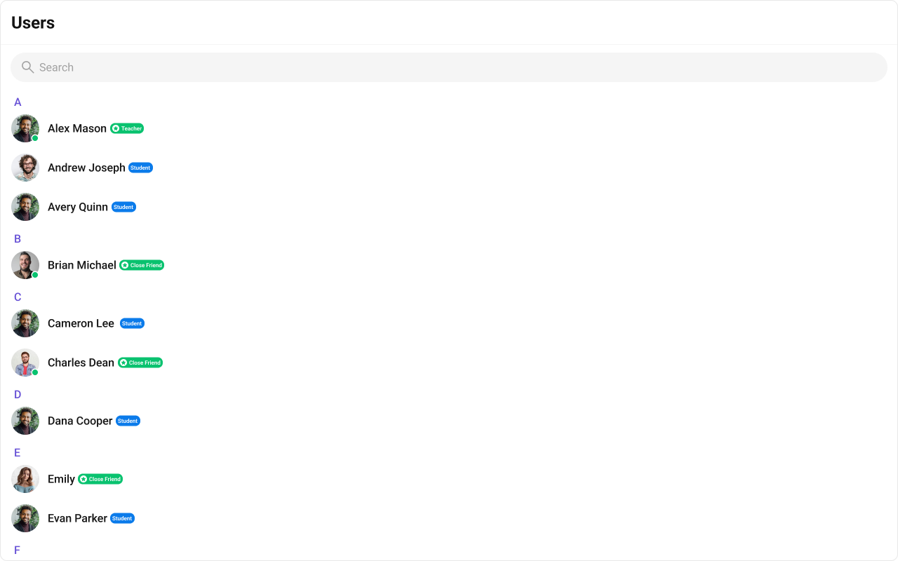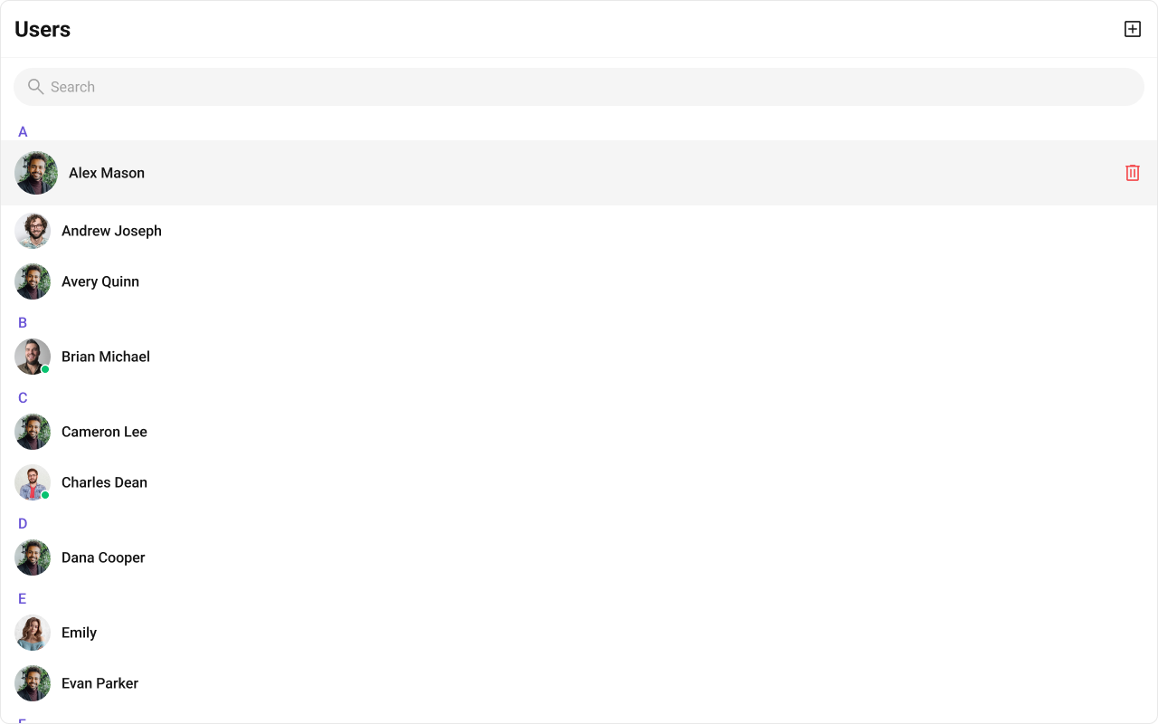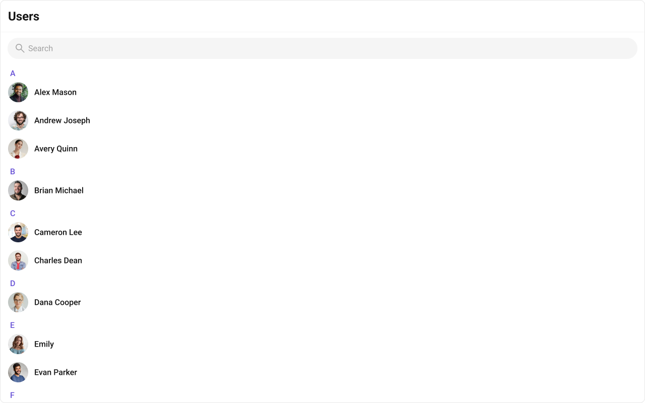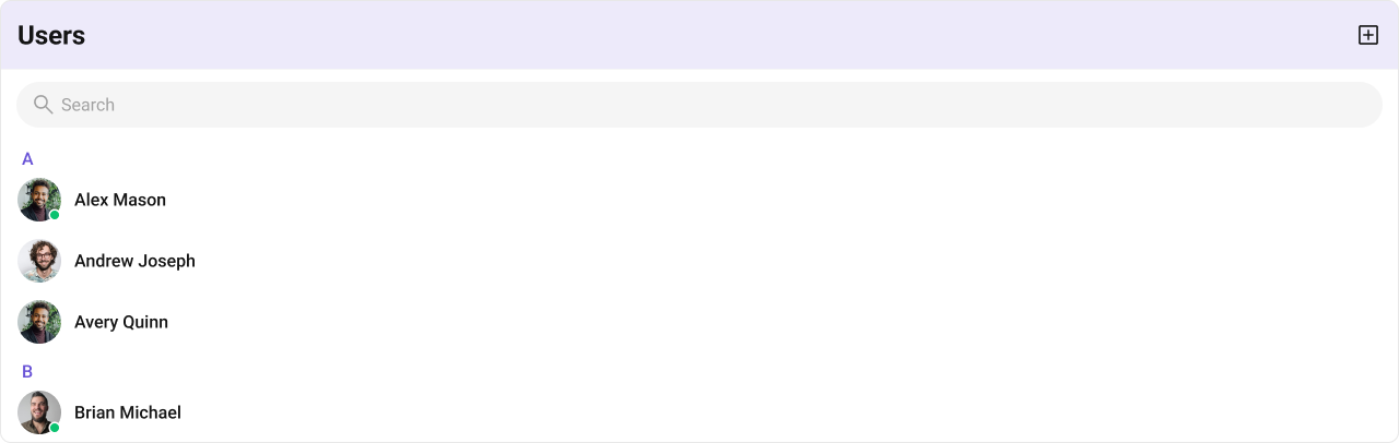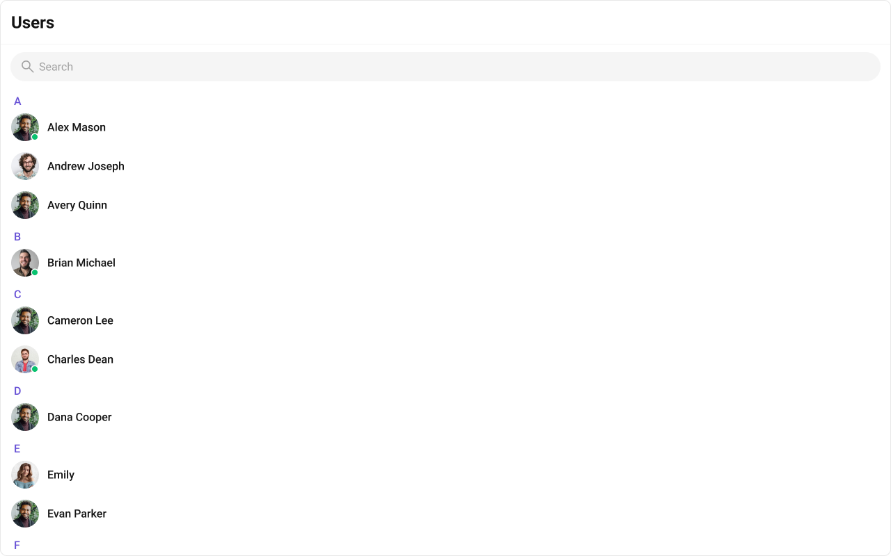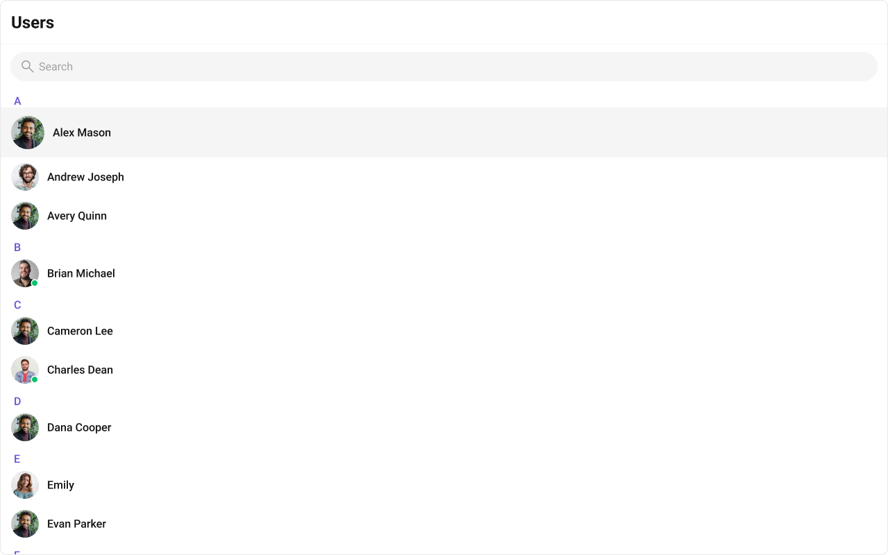 The component renders a scrollable list of interactive items. Each user row is keyboard-focusable and activates on Enter/Space. The context menu (options) is accessible via keyboard. Avatar images include the user name as alt text. Section headers (A, B, C…) provide visual grouping for alphabetical navigation. For screen readers, the user list is rendered as a semantic list. Status indicators (online/offline) use CSS mask images — addaria-label attributes via itemView if screen reader descriptions are needed for these visual indicators.