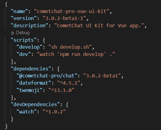 cometchat-pro-vue-ui-kitinto your project’s package.json and install them. - We are using emoji-mart-vue-fast Please install respective library depending on your Vue version